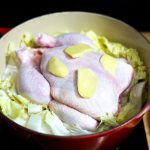 - In a pot with a tight fitting lid, place the onion, apple, carrots and half the ginger at the bottom. Arrange the napa cabbage on top and place the whole chicken on top of the cabbage. Season with 1 teaspoon kosher salt. Place remaining slices of ginger on top.